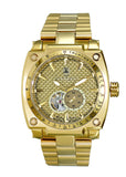 Case Case Measurements: L-47.0 mm W-45.0 mm H - 13.0 mm Case Material: Stainless Steel (Silver tone) Crown: Push / Pull Crystal: Mineral Bezel: Stationary, Gold tone Polished Bezel Dial: Gold Carbon Fiber Dial, Luminous Dot Marker, and Silver tone Numeric Hour indicator , Luminous Hour-Minute Hands Back Case: Screw-Down Case back Band Bracelet Measurement: W - 26.50 mm L- 8.50 in Maximum Wrist Size: 10.25 in Bracelet Material: Stainless Steel (Gold tone), partly polished Clasp: Push button fold over dual deployment clasp, with original logo Movement Type: Automatic (Japan Citizen Made) Caliber: Citizen - 21 jewels 82S5 Water Resistance: 10 ATM - 100 meters - 330 feet