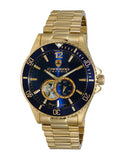 Case Case Measurements: L-44.0 mm W-44.0 mm H - 15.0 mm Case Material: Stainless Steel (Gold tone) Crown: Screw down Crystal: Mineral Bezel: Rotating Unidirectional, Aluminum polished Bezel, Blue color in Gold tone trim Dial: Blue Metal Dial, Luminous Index Marker and Numeric Hour indicator , Luminous Hour-Minute Hands Back Case: Exhibition Screw-Down Case back Band Bracelet Measurement: W - 21.50 mm L- 8.50 in Maximum Wrist Size: 10.25 in Bracelet Material: Stainless Steel (Gold tone), partly polished Clasp: Push button fold over dual deployment and safety clasp, with original logo Movement Type: Automatic (Japan Made) Caliber: MIYOTA 82S5 - 21 JEWELS. Water Resistance: 20 ATM - 200 meters - 660 feet