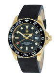 Case Case Measurements: L-42.0 mm W-42.0 mm H - 12.0 mm Case Material: Stainless Steel (Gold tone) Crown: Gold tone, Medium Post, Water proof, Screw-down. Crystal: Mineral, with Magnifying Date. Bezel: Rotating Uni-Directional, Blue Ceramic in Gold tone trim. Dial: Black Enamel Date Window Dial, Luminous Index hour indicator , and Hour-Minute Hand in Gold tone. Back Case: Screw-Down Case back Band Bracelet Measurement: W - 22.0 mm L- 8 in Maximum Wrist Size: 9.50 in Bracelet Material: Black Sued Genuine Leather band, Gold tone Buckle polished. Clasp: Push button fold over dual deployment clasp, with original logo Movement Type: Quartz (Swiss Made) Caliber: Ronda - 515.24D Water Resistance: 10 ATM - 100 meters - 330 feet