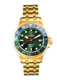 Case Case Measurements: L-44.50 mm W-44.50 mm H - 14.0 mm Case Material: Stainless Steel (Gold-IP tone) Crown: Push-Pull Crystal: Mineral Bezel: Rotating Unidirectional, matte polished Bezel,, Gold-IP tone Green/Blue Dial: Green, Metal Dial, Luminous Index Marker Hour indicator, Luminous Hour-Minute Hands Back Case: Stainless Steel, Screw down