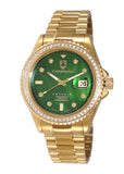 Case Case Measurements: L-44.0 mm W-44.0 mm H - 15.0 mm Lug-Lug - 53.50mm Case Material: Stainless Steel (Goldtone tone) Crown: Screw down Crystal: Mineral, with magnifying glass Bezel: Rotating Unidirectional, Guniune Sapphire Gem Stone (61 pcs Setiing Stone). Dial: Green, (MOP) Mother of Pearl, Luminous Index Marker Hour indicator and (8 pcs Setting Stone) Genuine Sapphire Stone, Luminous Hour-Minute Hands Goldtone. Back Case: Exhibition, Screw down