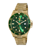 Case Case Measurements: L-44.0 mm W-44.0 mm H - 15.0 mm Case Material: Stainless Steel (Gold tone) Crown: Screw down Crystal: Mineral Bezel: Rotating Unidirectional, Aluminum polished Bezel, Green color with Gold tone trim Dial: Green Metal Dial Sun ray , Luminous Index Marker Hour indicator , Luminous Hour-Minute Hands BackCase: Exhibition, Screw down