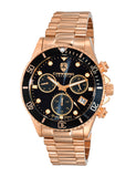 Case Case Measurements: L-44.0 mm W-44.0 mm H - 15.0 mm Case Material: Stainless Steel (Rose tone) Crown: Screw down, with function pusher Crystal: Mineral Bezel: Rotating Unidirectional, Aluminum polished Bezel, Black color with Rose tone trim Dial: Black Sun-ray Metal Dial, Luminous Index Dot Marker and Hour indicator , Luminous Hour-Minute Hands BackCase: Exhibition, Screw down