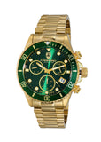 Case Case Measurements: L-44.0 mm W-44.0 mm H - 15.0 mm Case Material: Stainless Steel (Gold tone) Crown: Screw down, with function pusher Crystal: Mineral Bezel: Rotating Unidirectional, Aluminum polished Bezel, Green color with Gold tone trim Dial: Green Sun-ray Metal Dial, Luminous Index Dot Marker and Hour indicator , Luminous Hour-Minute Hands BackCase: Exhibition, with Screw down