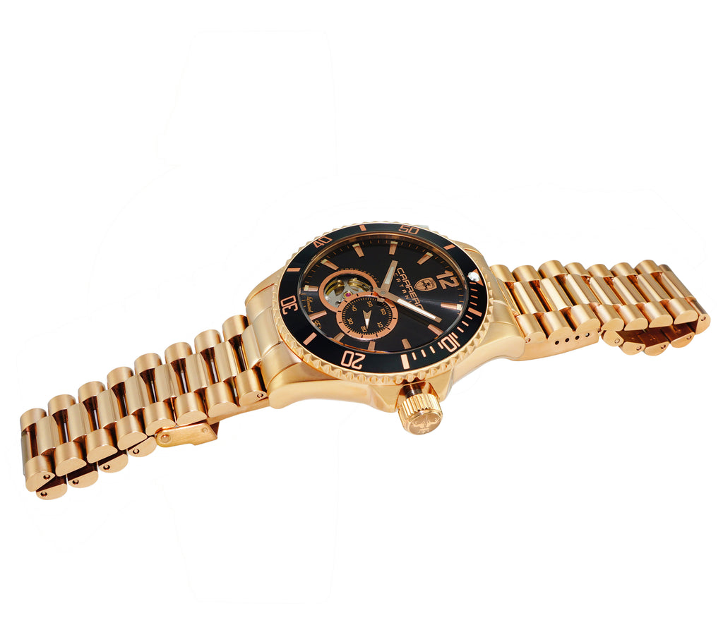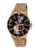 Case Case Measurements: L-44.0 mm W-44.0 mm H - 15.0 mm Case Material: Stainless Steel (Rose tone) Crown: Screw down Crystal: Mineral Bezel: Rotating Unidirectional, Aluminum polished Bezel, Black color with Rose tone trim, Luminous Dot at 12 o'clock position Dial: Black Sun-ray Metal Dial, Luminous Index Dot Marker and Hour indicator , Luminous Hour-Minute Hands. Second Sub-dial and Heart beat. BackCase: Exhibition, Screw down