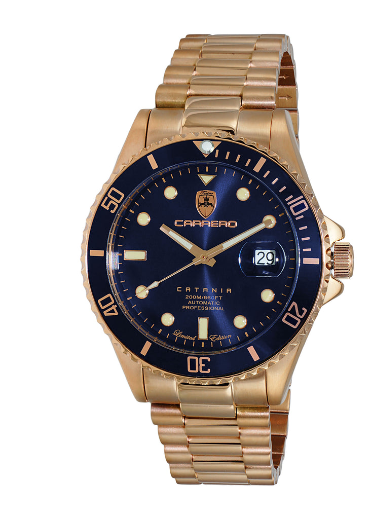 Case Case Measurements: L-44.0 mm W-44.0 mm H - 15.0 mm Case Material: Stainless Steel (Rose tone) Crown: Screw down Crystal: Mineral Bezel: Rotating Unidirectional, Aluminum polished Bezel, Blue color with Rose tone trim Dial: Blue Metal Dial Sun ray , Luminous Index Marker Hour indicator , Luminous Hour-Minute Hands BackCase: Exhibition, Screw down