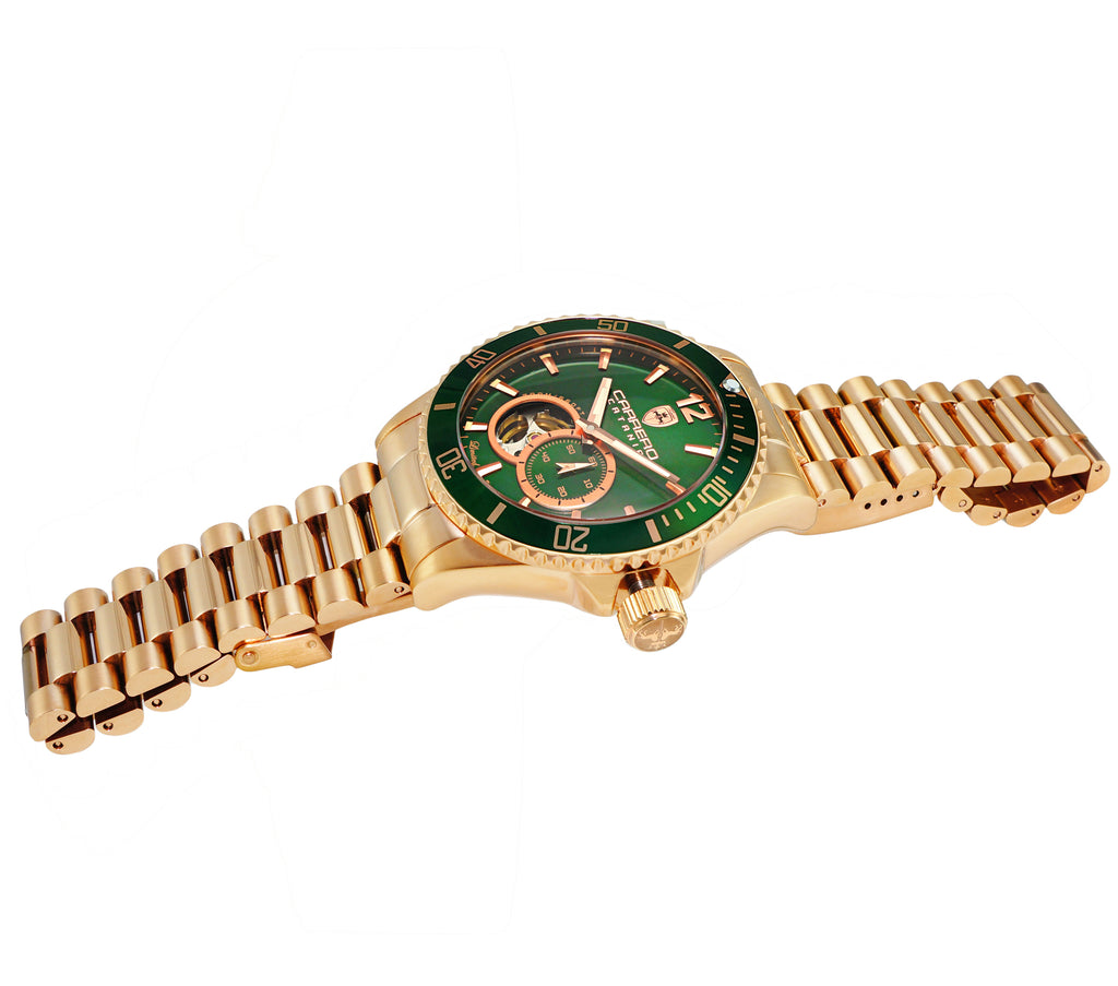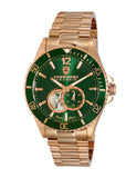 Case Case Measurements: L-44.0 mm W-44.0 mm H - 15.0 mm Case Material: Stainless Steel (Rose tone) Crown: Screw down Crystal: Mineral Bezel: Rotating Unidirectional, Aluminum polished Bezel, Green color with Rose tone trim, Luminous Dot at 12 o'clock position Dial: Green Sun-ray Metal Dial, Luminous Index Dot Marker and Hour indicator , Luminous Hour-Minute Hands. Second Sub-dial and Heart beat. BackCase: Exhibition, Screw down