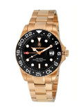 Case Case Measurements: L-42.0 mm W-42.0 mm H - 12.0 mm Case Material: Stainless Steel (Gold tone) Crown: Rose tone, Medium Post, Water proof, Screw-down. Crystal: Mineral, with Magnifying Date. Bezel: Rotating Uni-Directional, Black Ceramic -White Numeral in Gold tone trim. Dial: Black Enamel Date Window Dial, Luminous Index hour indicator , and Hour-Minute Hand in Gold tone. Back Case: Screw-Down Case back Band Bracelet Measurement: W - 22.0 mm L- 8 in Maximum Wrist Size: 9.50 in Bracelet Material: Stainless Steel , Rose tone Middle links polished. Clasp: Push button fold over dual deployment clasp, with original logo Movement Type: Quartz (Swiss Made) Caliber: Ronda - 515.24D Water Resistance: 10 ATM - 100 meters - 330 feet