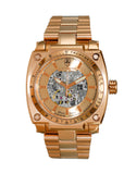 Case Case Measurements: L-47.0 mm W-45.0 mm H - 13.0 mm Case Material: Stainless Steel (Rose tone) Crown: Push / Pull Crystal: Mineral Bezel: Stationary, 18k Rose tone Polished Bezel Dial: 18k Rose tone, Rose Sun-ray Dial, Luminous Dot Marker, and Gold tone Numeric Hour indicator , Luminous Hour-Minute Hands Back Case: Exhibition Screw-Down Case back Band Bracelet Measurement: W - 26.50 mm L- 8.50 in Maximum Wrist Size: 10.25 in Bracelet Material: Stainless Steel (Rose tone), partly polished Clasp: Push button fold over dual deployment clasp, with original logo Movement Type: Automatic (Japanese Made) Caliber: Japan - 8N24 Water Resistance: 10 ATM - 100 meters - 330 feet