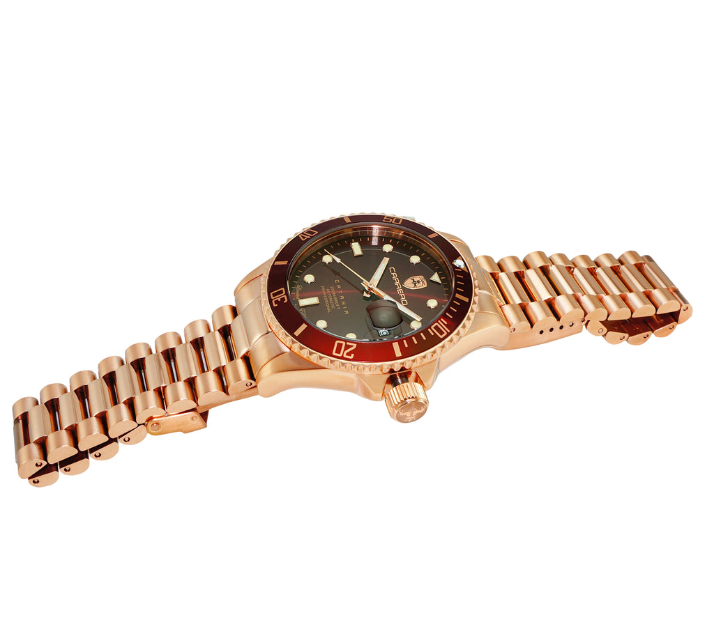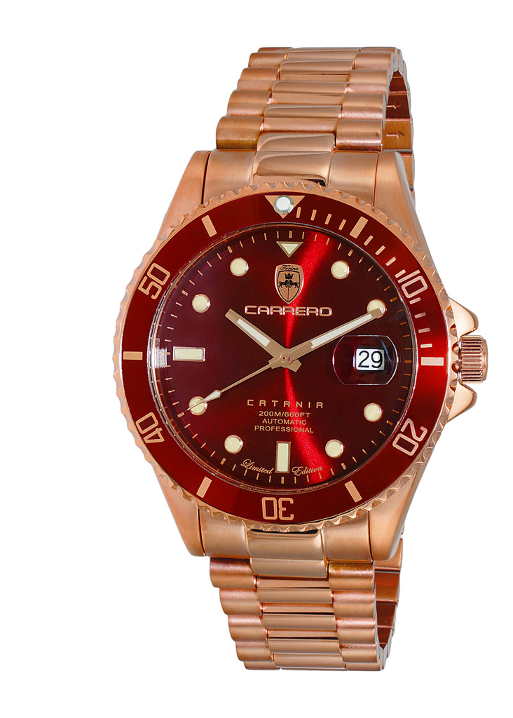 Case Case Measurements: L-44.0 mm W-44.0 mm H - 15.0 mm Case Material: Stainless Steel (Rose tone) Crown: Screw down Crystal: Mineral Bezel: Rotating Unidirectional, Aluminum polished Bezel, Maroon color with Rose tone trim Dial: Maroon Metal Dial Sun ray , Luminous Index Marker Hour indicator , Luminous Hour-Minute Hands BackCase: Exhibition, Screw down