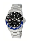 Case Case Measurements: L-42.0 mm W-42.0 mm H - 12.0 mm Case Material: Stainless Steel (Silver tone) Crown: Silver tone, Medium Post, Water proof, Screw-down. Crystal: Mineral, with Magnifying Date. Bezel: Rotating Uni-Directional, Black/Blue Ceramic in Silver tone trim. Dial: Black Enamel Date Window Dial, Luminous Index hour indicator , and Hour-Minute Hand in silver tone. Back Case: Screw-Down Case back Band Bracelet Measurement: W - 22.0 mm L- 8 in Maximum Wrist Size: 9.50 in Bracelet Material: Stainless Steel , Silver tone Middle links polished. Clasp: Push button fold over dual deployment clasp, with original logo Movement Type: Quartz (Swiss Made) Caliber: Ronda - 515.24D Water Resistance: 10 ATM - 100 meters - 330 feet