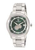 Case Case Measurements: L-48.50 mm W-42.0 mm H - 12.25 mm Case Material: Stainless Steel (Silver tone) Crown: Push-Pull Crystal: Dome Mineral Bezel: Stationary, Matte polished Bezel, All Silver tone. Dial: Textured Metal Sunray, Open Heart, Green Metal Dial, Luminous Hour-Minute Hands Back Case: Exhibition, Screw down