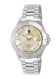 Case Case Measurements: L-44.0 mm W-44.0 mm H - 15.0 mm Case Material: Stainless Steel (Silver tone) Crown: Screw down Crystal: Mineral Bezel: Rotating Unidirectional, Matte polished Bezel, All Stainless Steel - Silver tone. Dial: Chamoagne (Gold) MOP (Mother of Pearl), l, Luminous Index Marker Hour indicator , Luminous Hour-Minute Hands Back Case: Exhibition, Screw down