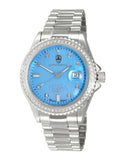 Case Case Measurements: L-44.0 mm W-44.0 mm H - 15.0 mm Lug-Lug - 53.50mm Case Material: Stainless Steel (Silver tone) Crown: Screw down Crystal: Mineral, with magnifying glass Bezel: Rotating Unidirectional, Guniune Sapphire Gem Stone (61 pcs Setiing Stone). Dial: Sky Blue, (MOP) Mother of Pearl, Luminous Index Marker Hour indicator and (8 pcs Setting Stone) Genuine Sapphire Stone, Luminous Hour-Minute Hands Silver tone. Back Case: Exhibition, Screw down