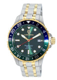 Case Case Measurements: L-44.50 mm W-44.50 mm H - 14.0 mm Case Material: Stainless Steel (2-Tone Gold-IP tone) Crown: Push-Pull Crystal: Mineral Bezel: Rotating Unidirectional, matte polished Bezel,, Gold-IP tone Green/Blue Dial: Green, Metal Dial, Luminous Index Marker Hour indicator, Luminous Hour-Minute Hands Back Case: Stainless Steel, Screw down