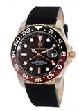Case Case Measurements: L-42.0 mm W-42.0 mm H - 12.0 mm Case Material: Stainless Steel (2tone Rose) Crown: Rose tone, Medium Post, Water proof, Screw-down. Crystal: Mineral, with Magnifying Date. Bezel: Rotating Uni-Directional, Black-Brown Ceramic in Rose tone trim. Dial: Black Enamel Date Window Dial, Luminous Index hour indicator , and Hour-Minute Hand in Rose tone. Back Case: Screw-Down Case back Band Bracelet Measurement: W - 22.0 mm L- 8 in Maximum Wrist Size: 9.50 in Bracelet Material: Black Suede Genuine Leather. Clasp: Push button fold over dual deployment clasp, with original logo Movement Type: Quartz (Swiss Made) Caliber: Ronda - 515.24D Water Resistance: 10 ATM - 100 meters - 330 feet