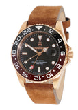 Case Case Measurements: L-42.0 mm W-42.0 mm H - 12.0 mm Case Material: Stainless Steel (2tone Rose) Crown: Rose tone, Medium Post, Water proof, Screw-down. Crystal: Mineral, with Magnifying Date. Bezel: Rotating Uni-Directional, Black-Brown Ceramic in Rose tone trim. Dial: Black Enamel Date Window Dial, Luminous Index hour indicator , and Hour-Minute Hand in Rose tone. Back Case: Screw-Down Case back Band Bracelet Measurement: W - 22.0 mm L- 8 in Maximum Wrist Size: 9.50 in Bracelet Material: Suede Brown Genuine Leather Band Clasp: Rose tone Buckle with logo Movement Type: Quartz (Swiss Made) Caliber: Ronda - 515.24D Water Resistance: 10 ATM - 100 meters - 330 feet