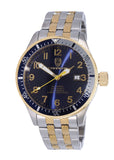 Case Case Measurements: L-44.50 mm W-44.50 mm H - 14.0 mm Case Material: 316L Stainless Steel (2-Tone Gold) Crown: Screw down Crystal: Mineral Bezel: Rotating Unidirectional, Aluminum polished Bezel, Blue-Silver with Gold tone trim. Dial: Blue Metal Dial, Numeric Hour Indicator, Luminous Hour-Minute-Second Hands Back Case: Screw down, Mineral Crsytal