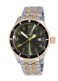Case Case Measurements: L-44.50 mm W-44.50 mm H - 14.0 mm Case Material: 316L Stainless Steel (2-Tone Gold) Crown: Screw down Crystal: Mineral Bezel: Rotating Unidirectional, Aluminum polished Bezel, Black with Gold tone trim. Dial: Green Metal Dial, Numeric Hour Indicator, Luminous Hour-Minute-Second Hands Back Case: Screw down, Mineral Crsytal