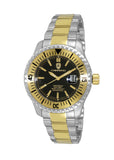 Case Case Measurements: L-45.50 mm W-45.50 mm H - 16.0 mm Case Material: Stainless Steel (Silver tone) Crown: Silver tone, Long Post, Water proof, Screw/down. Crystal: Sapphire, with Magnifying Date. Bezel: Rotating Uni-Directional, Stainless Steel Gear Design Polished in Gold tone. Dial: Black Enamel Date Window Dial, Luminous Index hour indicator , and Hour-Minute Hand in Gold tone. Back Case: Exhibition Screw-Down Case back Band Bracelet Measurement: W - 22.0 mm L- 8 in Maximum Wrist Size: 9.50 in Bracelet Material: Stainless Steel (2-tone), Gold tone Middle links party polished. Clasp: Push button fold over dual deployment clasp, with original logo Movement Type: Automatic (Swiss Made) Caliber: SELLITA SW-200 - 26 JEWELS Water Resistance: 20 ATM - 200 meters - 660 feet