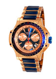 Case Case Measurements: L-45.0 mm W-50.0 mm H - 13.50 mm Case Material: Stainless Steel ,Rose tone, and Admiral Blue High-tech ceramic Crown: Rose tone, Screw/down, with active pushers 2:00 - Push button (Start /Stop), 4:00 -Push button (Split Reset). Crystal: Mineral Bezel: Rotating Directional, Aluminum Blue polished in Silver tone trim Dial: Admiral Blue Sun-ray Dial, Luminous Index hour indicator , and Hour-Minute Hands, Rose tone Sun-ray Sub dials Back Case: Screw-Down Case back Band Bracelet Measurement: W - 24.0 mm L- 8 in Maximum Wrist Size: 9.75 in Bracelet Material: Stainless Steel (Polished Rose tone), Admiral Blue high-tech ceramic middle links Clasp: Push button fold over dual deployment clasp, with original logo Movement Type: Chronograph (Ronda Swiss Made) Caliber: Ronda - R9 Z60 Water Resistance: 10 ATM - 200 meters - 660 feet