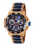 Case Case Measurements: L-45.0 mm W-50.0 mm H - 13.50 mm Case Material: Rose tone, Stainless Steel and Blue High-tech ceramic Crown: Rose tone, Screw/down, with active pushers 2:00 - Push button (Start /Stop), 4:00 -Push button (Split Reset). Crystal: Mineral Bezel: Rotating Directional, Aluminum Black polished in Rose tone trim Dial: Blue Sun-ray Dial, Luminous Index hour indicator , and Hour-Minute Hands, Rose tone trim Sun-ray Sub dials Back Case: Screw-Down Case back Band Bracelet Measurement: W - 24.0 mm L- 8 in Maximum Wrist Size: 9.75 in Bracelet Material: Stainless Steel (Polished Rose tone), Blue high-tech ceramic middle links Clasp: Push button fold over dual deployment with safety clasp, in original logo Movement Type: Chronograph (Ronda Swiss Made) Caliber: Ronda - R9 Z60 Water Resistance: 10 ATM - 200 meters - 660 feet