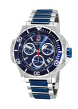 Case Case Measurements: L-45.0 mm W-50.0 mm H - 13.50 mm Case Material: Silver tone, Stainless Steel and Blue High-tech ceramic Crown: Silver tone, Screw/down, with active pushers 2:00 - Push button (Start /Stop), 4:00 -Push button (Split Reset). Crystal: Mineral Bezel: Rotating Directional, Aluminum Blue polished in Silver tone trim Dial: Blue Sun-ray Dial, Luminous Index hour indicator , and Hour-Minute Hands, Silver tone trim Sun-ray Sub dials Back Case: Screw-Down Case back Band Bracelet Measurement: W - 24.0 mm L- 8 in Maximum Wrist Size: 9.75 in Bracelet Material: Stainless Steel (Polished Silver tone), Blue high-tech ceramic middle links Clasp: Push button fold over dual deployment with safety clasp,in original logo Movement Type: Chronograph (Ronda Swiss Made) Caliber: Ronda - R9 Z60 Water Resistance: 10 ATM - 200 meters - 660 feet
