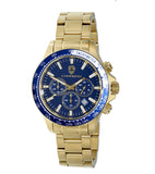 Case Case Measurements: L-44.0 mm W-44.0 mm H - 13.50 mm Case Material: 316-L Solid Stainless Steel (Gold tone) Crown: Gold tone, Long Post, Water proof, Screw-down. Crystal: Sapphire Coated Bezel: Stationary, Blue -Silver Aluminum, with Yellow Tachymeter Scale. Dial: Blue Enamel, with Blue Sun ray Sub-dials, Date Window Dial, Luminous Index hour indicator , and Hour-Minute Hand in Silver tone. Back Case: Screw-Down Case back Band Bracelet Measurement: W - 20.0 mm L- 8. in Maximum Wrist Size: 9.75 in Bracelet Material: Stainless Steel , Gold tone polished. Clasp: Push button fold over dual deployment clasp, with original logo Movement Type: Quartz Chronograph (Japan Made) Caliber: TMI - VD53 Water Resistance: 10 ATM - 100 meters - 330 feet