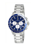 Case Case Measurements: L-44.0 mm W-44.0 mm H - 13.50 mm Case Material: 316-L Solid Stainless Steel (Silver tone) Crown: Silver tone, Long Post, Water proof, Screw-down. Crystal: Sapphire Coated Bezel: Stationary, Blue-Silver Aluminum, with Silver Tachymeter Scale. Dial: Blue Enamel, with Silver Sun ray Sub-dials, Date Window Dial, Luminous Index hour indicator , and Hour-Minute Hand in Silver tone. Back Case: Screw-Down Case back Band Bracelet Measurement: W - 20.0 mm L- 8. in Maximum Wrist Size: 9.75 in Bracelet Material: Stainless Steel , Silver tone polished. Clasp: Push button fold over dual deployment clasp, with original logo Movement Type: Quartz Chronograph (Japan Made) Caliber: TMI - VD53 Water Resistance: 10 ATM - 100 meters - 330 feet